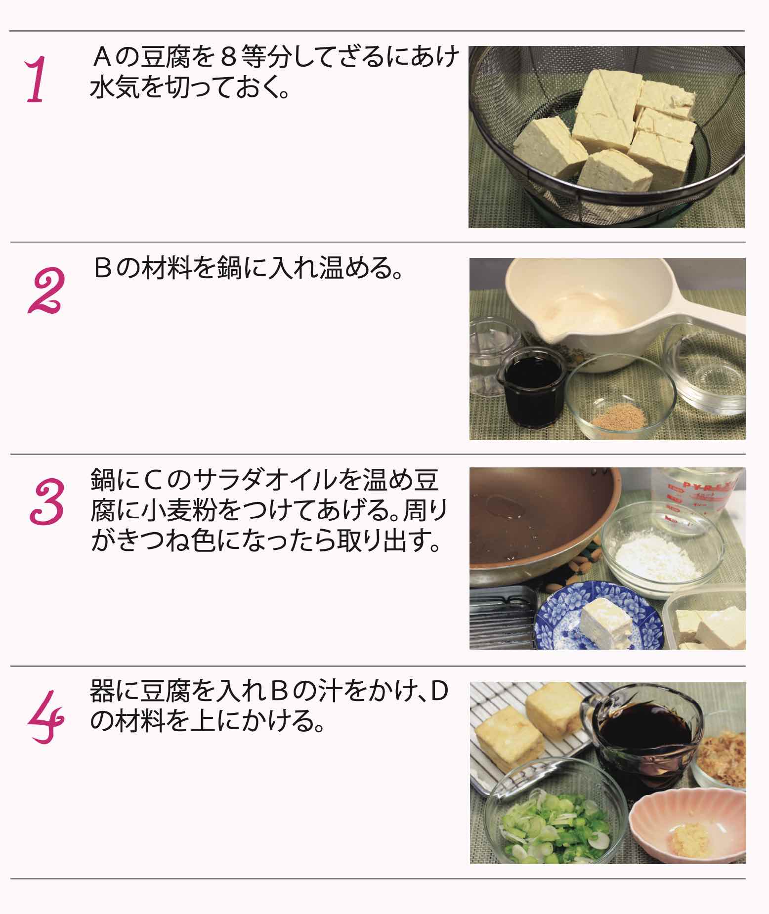 - 1. Aの豆腐を8等分してざるにあけ 水気を切っておく。
